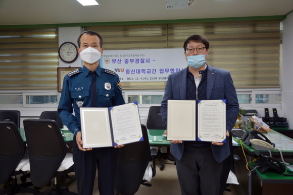 와이즈유(영산대학교) 경찰행정학과는 지난 15일 부산 중부경찰서와 우수한 경찰 인력을 양성하기 위한 관학(官學) 업무협약을 체결했다. 이 자리에는 박찬혁 경찰행정학과장과 정규열 중부경찰서장이 참석했다.