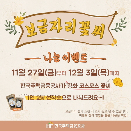 한국주택금융공사(주금공, HF)는 공사가 위치한 부산시 남구 문현금융단지에 조성한 ‘HF 보금자리꽃밭’에서 채종한 코스모스 씨앗 14㎏을 나눠주는 SNS 이벤트를 진행한다고 27일 밝혔다.