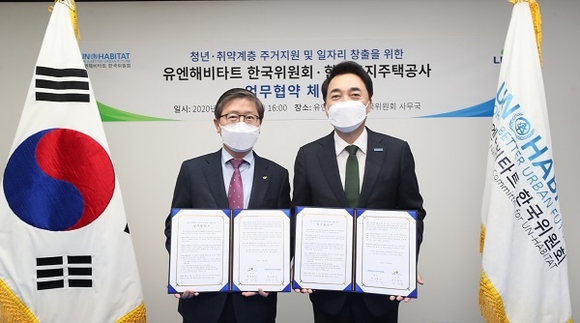 협약에 따라 LH는 장기공실 상태의 공공임대주택 및 임대상가를 제공하고, UN-Habitat 한국위원회는 이를 활용해 청년·취약계층의 주거안정과 창업 등 일자리 창출에 활용하는 한편 LH 사회주택 운영에도 참여할 계획이다.