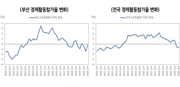 보고서를 작성한 김현욱 경제동향분석위원은 “부산의 고용률은 실업률보다 경제활동 참가율의 영향을 더 크게 받고 있다”며 “경제활동 참가율의 중장기 변화를 살펴보면 지난 2016년 하반기 이후 전국보다 큰 하락세를 보여 대응 전략 마련이 필요한 상황”이라고 전했다.