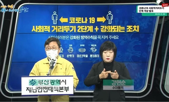 부산시는 이날 오후 1시 30분경 유튜브 등 온라인으로 기자회견을 열고 사회적 거리두기 강화 조치에 따른 변화 사항에 대해 설명했다.