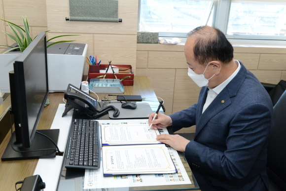 한국승강기안전공단 안정태 경영기획이사가 30일 자신의 집무실에서 비대면으로 인천교통공사와 업무협약서에 서명하고 있다. (사진=승강기안전공단 제공)