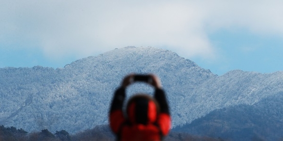 11월 마지막 날인 30일 경남 함양군 마천면 뇌전마을에서 바라 본 지리산 천왕봉이 상고대로 덮여 있다. (사진=함양군 제공)