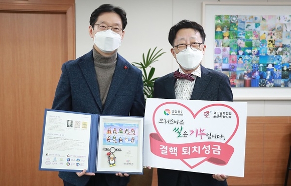 김경수 경남도지사는 30일 집무실에서 '2020년 크리스마스 씰 증정식'을 갖고 박양동 대한결핵협회 울산‧경남지부장에게 경남도의 결핵퇴치 성금을 전달한 뒤 올해 크리스마스 씰을 수령했다.