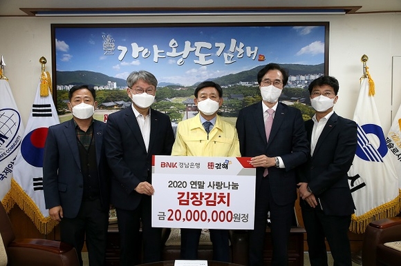 BNK경남은행 사랑나눔재단은 30일 소외된 이웃과 더불어 사는 사회분위기 조성을 위한 김해시 '2020년 사랑의 김장나눔 행사'에 2천만원 상당의 김치를 기탁했다.