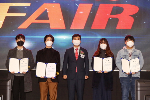 지난달 30일 동아대학교 승학캠퍼스 체육관 ‘DA-LINC+ FAIR’에서 진행된 ‘제1회 CDS 빅데이터 경진대회’ 시상식에서 조승현 학생(왼쪽에서 두 번째) 등 수상자들이 이해우(가운데) 총장과 기념촬영을 하고 있다. (사진=동아대 제공)