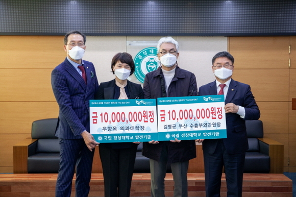 김 원장과 김 과장 부부는 “모교가 나날이 발전하는 모습을 보면서 동문으로서 자부심을 느낀다. 경상의대가 지역민의 건강과 보건 향상에 크게 기여하기를 바라는 마음에서 발전기금을 출연하게 됐다”고 전했다. 우 학장도 “앞으로도 경상대가 발전하기 위해 발전기금 확충에 더욱 노력하겠다”고 말했다.