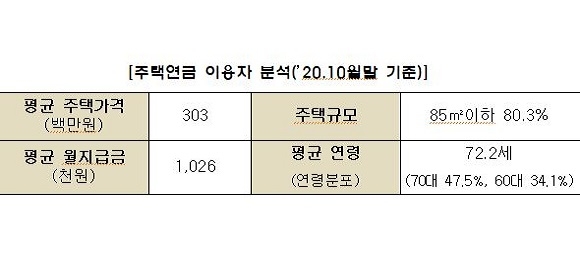 한편 주택연금은 지난 2007년 도입 이후 누적 가입자가 지난달 말 기준 8만 가구를 넘어선 것으로 조사됐다. 조사 결과, 이들의 평균 주택가격은 3억 300만원으로 주택 규모는 85㎡가 대다수인 80.3%로 집계됐다.