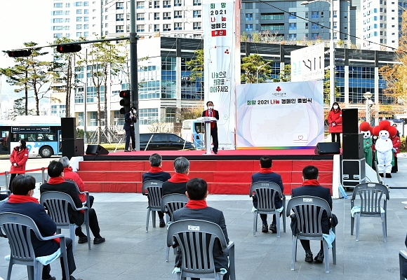 지난 1일 오후 부산진구 소재 송상현광장에서 ‘희망 2021 나눔 캠페인 출범식’과 ‘온도탑 제막식’이 열린 가운데 김석준 부산시교육감이 참석해 축사하고 있다.