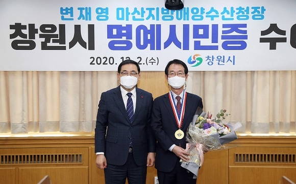 경남 창원시는 2일 시청 접견실에서 마산항 발전과 지역경제 활성화를 위해 노력한 변재영 마산지방해양수산청장에게 창원시 명예시민증을 수여했다고 밝혔다.