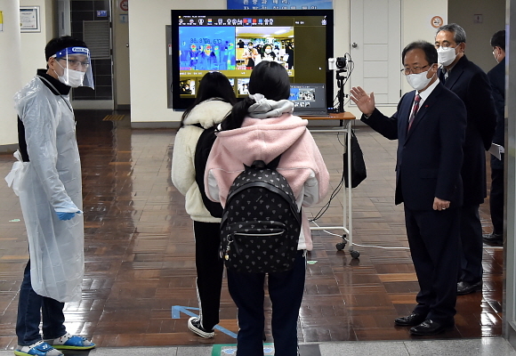 2021학년도 대학수학능력시험(수능) 당일인 3일 오전 7시 20분경 김석준 부산시교육감(오른쪽)이 제23지구 시험장 중 하나인 경남여고를 방문해 입실하는 수험생들을 응원하고 있다. (사진=부산시교육청 제공)