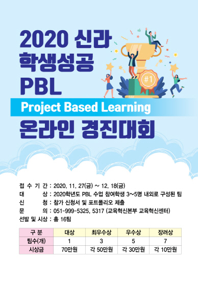 신라대학교 교육혁신본부(교육혁신센터)는 PBL(Project Based Learning, 프로젝트중심학습) 수업 참여 학생의 문제해결 능력 향상과 산업현장에서 필요로 하는 창의 인재 양성을 위한 ‘2020 신라 학생성공 PBL 온라인 경진대회’를 개최한다고 3일 밝혔다.