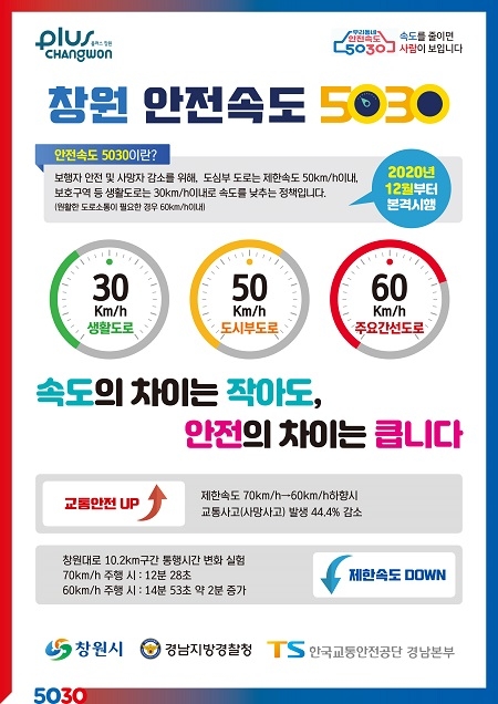 '창원형 안전속도 5030'은 교통사고 발생 가능성을 줄이고 보행자 안전을 확보하는 차원에서 차량 제한속도를 하향하는 보행자중심의 안전 정책이다.