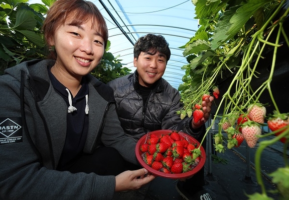 7일 산청군 신등면 최진우·박민경 부부 농가에서 제철을 맞은 딸기 수확이 한창이다. 높은 당도와 선명한 빛깔을 띤 산청 딸기는 4년 연속 대한민국 대표브랜드 대상을 수상하는 등 맛과 품질을 인정받고 있다. (사진=산청군 제공)