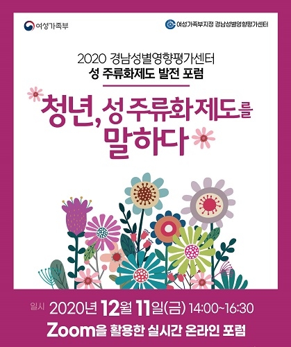 창원대학교가 위탁운영하는 여성가족부 지정 경남성별영향평가센터는 오는 11일 오후 2시 ‘청년, 성 주류화제도를 말하다’를 주제로 줌(Zoom)을 활용한 ‘2020 성 주류화제도 발전 온라인 포럼’을 개최한다고 8일 밝혔다.