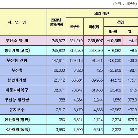 그 가운데 부산항 신항 예산은 신항 기반시설 확충을 위한 남 ‘컨’ 항만배후단지 조성, 서 ‘컨’ 임항교통시설 건설 등 예산 확보로 사업을 적기에 추진한다는 계획이다. 항만사업에 따른 어업 피해 보상비도 210억원이 배정돼 충분히 원활하게 사업 시행을 할 수 있을 것으로 기대된다고 부산해수청은 전했다.