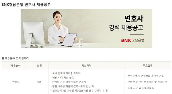 BNK경남은행은 은행 업무 관련 법률 자문, 소송 자문 및 지원 등의 업무를 담당할 경력직 변호사를 채용한다고 8일 밝혔다.