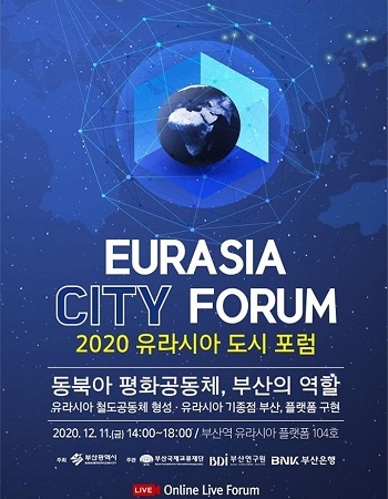 BNK부산은행과 부산연구원, 부산시 및 부산국제교류재단이 오는 11일 오후 2시 ‘2020 유라시아 도시포럼’을 온·오프라인으로 개최한다고 9일 밝혔다.