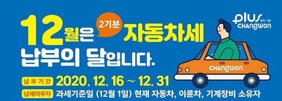 이번 정기분 자동차세는 과세기준일(12월 1일) 현재 창원시에 등록된 차량(자동차, 이륜자동차, 기계장비) 중 연납차량 및 연세액 10만원 이하(6월 정기분 전액부과) 차량을 제외한 자동차등록원부상 소유자에게 부과된다.