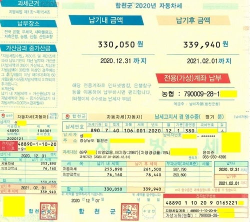 합천군 관계자는 “점점 늘어나는 고령자의 납세편익을 위해 '읽기 쉬운 지방세 고지서'로 제작 발송하여 납세자의 만족도를 높이고자 하였다”며 “자동차세는 우리군 지역개발과 군민 복지증진에 쓰여지는 소중한 재원이므로 반드시 납기 내에 납부해 줄 것”을 당부했다.
