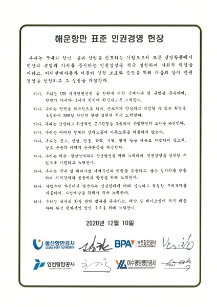 4개 항만공사(울산항만공사·부산항만공사·인천항만공사·여수광양항만공사)가 공동으로 마련한 인권경영헌장은 항만생태계의 모든 이해관계자 인권을 존중하는 인권경영 실천 의지를 대내외에 공표하기 위해 마련됐다.