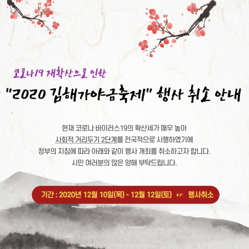 (재)김해문화재단은 코로나19의 확산세가 매우 높아 사회적 거리두기가 2단계로 격상됨에 따라 ‘제10회 김해가야금페스티벌’의 일부 프로그램을 취소, 마무리했다고 10일 밝혔다.