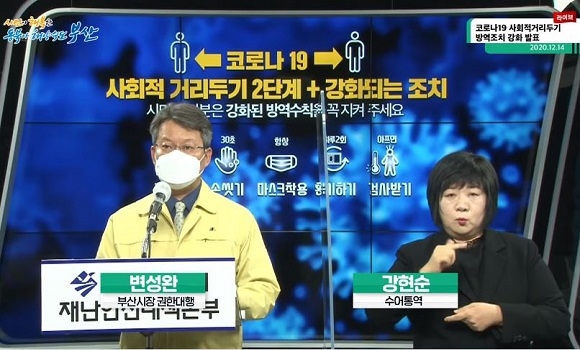 변성완 부산시장 권한대행은 14일 오후 1시 30분경 유튜브 등으로 온라인 기자회견을 열고 사회적 거리두기 결정 여부에 대해 위와 같이 발표했다.