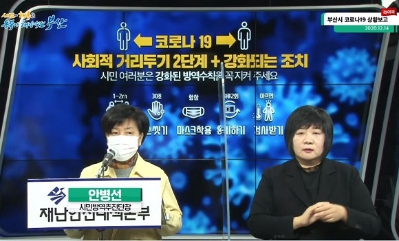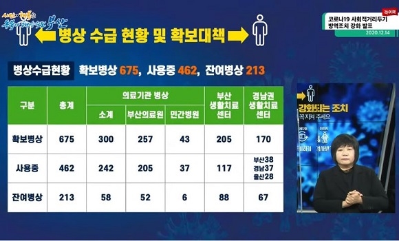 안병선 시민방역추진단장은 “집단감염이 발생한 인창요양병원 전체 입원자 수 525명 가운데 88명이 확진된 상태며 직원은 353명 중 10명, 간병인은 8명이 확진됐다. 확진자는 3층 병동에 환자 35명, 직원 5명, 간병인 4명이 확진됐으며 8~9층 병동에는 환자 53명, 직원 5명, 간병인 4명이 확진됐다”고 현황을 설명하며 “지난 13일 기준 부산지역 입원 병상 총 300개 중 사용 중인 병상은 243개로 중환자 병상은 18개 중 13개가 사용 중이며 부산생활치료센터는 120석 중 95명이 입소한 상태다. 현재 부산지역 내 위중증 환자는 총 9명 있다”고 전했다.
