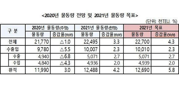 특히 환적 물동량 목표는 코로나19 팬데믹 전개 양상이 불확실함에도 전망치보다 20만TEU 정도 높은 1269만TEU로 설정했다. 이는 국내외 전문 기관의 경제·해운 시장 회복 전망과 BPA의 부산항 마케팅 전략을 고려한 것이라고 BPA는 설명했다.