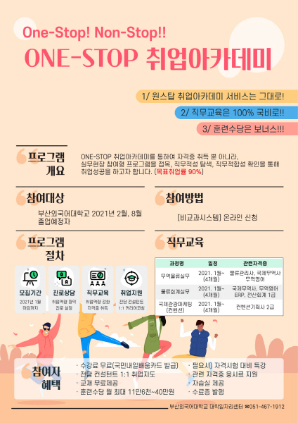 부산외국어대학교 대학일자리센터는 2021년 졸업을 앞둔 학생들의 취업역량 강화를 위한 ‘ONE-STOP 취업아카데미’를 개최한다고 16일 밝혔다.