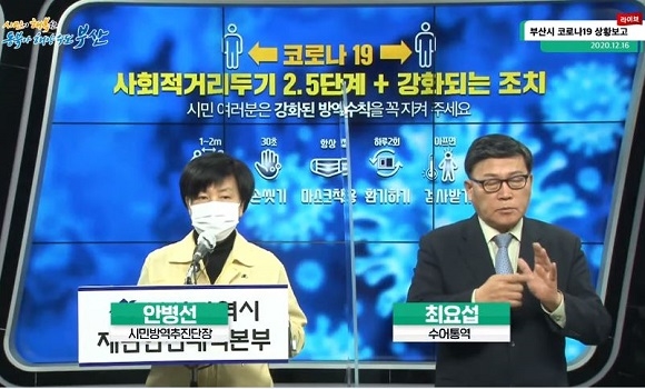 안병선 시민방역추진단장은 “인창요양병원의 정기검사에서 추가 환자가 나와 현재 확진자는 환자 98명, 직원 12명, 간병인 10명 총 120명으로 집계됐다. 또 제일나라요양병원의 확진자는 환자 4명, 직원 6명 총 10명이며 동래구 소재 수향탕은 접촉자 중 38명이 검사를 받아 4명이 신규로 추가돼 전체 6명을 기록하고 있다”고 설명하며 “최근 일주일간 부산에서 발생한 환자 수는 총 274명으로 일일 평균 39.1명을 기록하고 있다. 확진자 중 고령의 환자 비율이 높아지며 입원기간도 길어지고 보행이 어려우며 인지기능이 저하한 분이 많아 의료기관에서 환자 관리에 부담이 커지고 있는 상황”이라며 현 상황에 대한 우려를 전했다.