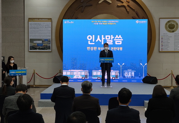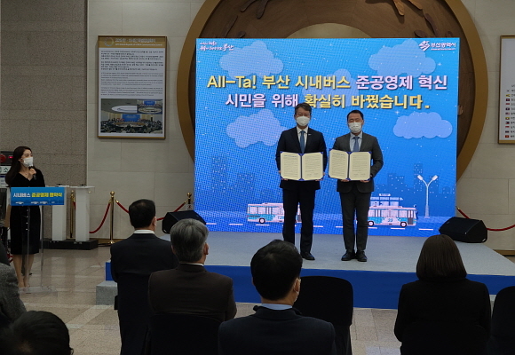 부산시는 16일 오후 4시 시청 1층 로비에서 시내버스운송사업조합과 함께 ‘부산 시내버스 준공영제 개정 협약 체결식’을 열었다.