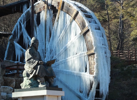 17일 경남 함양군 안의면 상원리 연암물레방아공원에 설치된 물레방아가 강추위에 꽁꽁 얼어 멈춰 서 있다. (사진=함양군 제공)