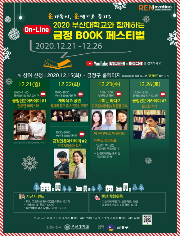 부산대학교는 오는 21일부터 26일까지 ‘2020 부산대학교와 함께하는 금정 BOOK 페스티벌’ 행사를 개최한다고 18일 밝혔다. 지난해에 이어 2회째 개최되는 이 행사는 올해 코로나19 상황을 고려해 100% 비대면 온라인으로 마련되며, 부산대와 금정구의 협력사업으로 진행된다.