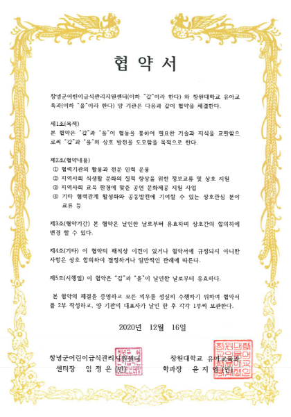 임정은 센터장(창원대 식품영양학과 교수)은 “이번 협약을 계기로 전문성을 갖춘 영유아 교육 프로그램 제공은 물론 이를 통해 관내 어린이·가족의 건강증진에 크게 기여할 것으로 기대한다”고 전했다.