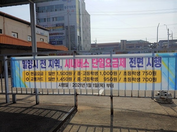이후 시는 시민중심의 새로운 밀양형 교통체계 구축 계획을 세우고 다가오는 1월 1일부터 시내버스가 운행되는 밀양시 전 지역에서 구간요금제를 전면 폐지하고 기존 시내버스 기본요금과 동일한 요금으로 이용할 수 있는 '시내버스 단일요금제'를 시행한다.