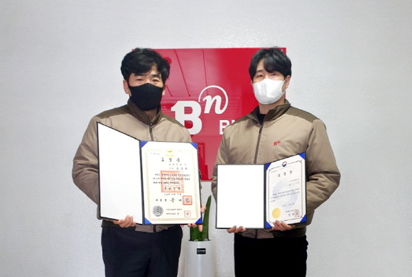 ‘제57회 무역의 날’을 맞아 산업포장을 수상한 비아이피 조부제 부장(왼쪽)과 산업통상자원부장관 표창을 수상한 비아이피 김수랑 조장(오른쪽)이 기념촬영을 하고 있다. (사진=비엔그룹 제공)