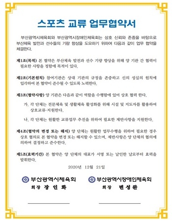 부산시체육회가 21일 오후 3시 부산시청 국제의전실에서 부산시장애인체육회와 함께 ‘스포츠 교류 업무협약식’을 연다고 밝혔다.