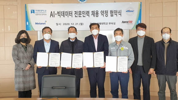 거제대학교 컴퓨터AI공학과는 21일 조욱성 총장, DSME정보시스템(주) 서흥원 대표, ForceTEC(주식회사 포스텍) 김상용 대표, Metanet DT(메타넷 대우정보) 박정식 대표 및 학과 교수들이 참석한 가운데 취업약정협약을 맺었다.