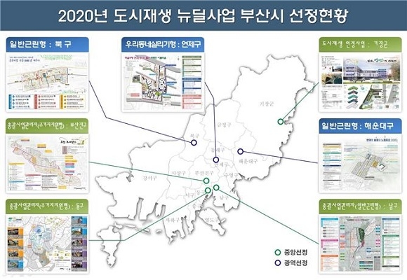 도시재생 뉴딜사업 공모는 국토부가 전국 시·도에서 제출한 활성화 계획을 직접 평가, 선정하는 것이다. 부산지역 내 선정지 가운데 ‘총괄사업관리자(공기업 주도)’ 방식은 ▲동구 좌천동 ▲남구 문현동 ▲부산진구 범천동 3곳이며 도시재생 인정사업 분야에는 기장군 일광면이 선정됐다.