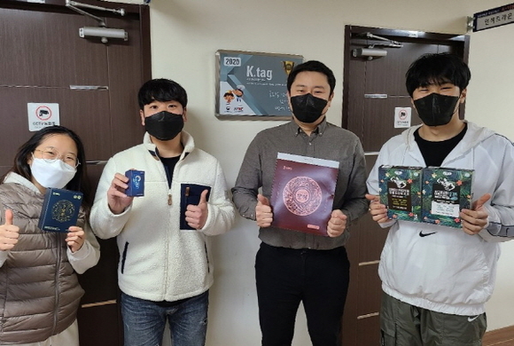 (왼쪽부터) 정나래, 김인기 씨, 김성호 대표, 이성우 씨가 기념촬영을 하고 있다. (사진=경상대 제공)