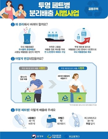 한편 시는 환경부의 ‘투명 페트병 별도배출 시범사업’에 선정돼 지난 2월부터 공동주택에 별도 수거함을 비치하고 각종 홍보와 함께 투명 페트병 수집 장려금 지급 등을 해왔다. 이에 부산 내 공동주택의 투명 페트병 별도배출 참여율은 73% 수준으로 타 시·도에 비해 높은 편인 것으로 조사된다.