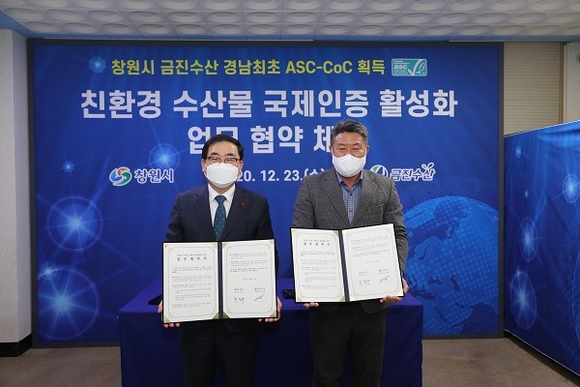 경남 창원시는 23일 금진수산과 친환경 수산물 국제인증(ASC) 활성화를 위한 업무협약을 체결했다.