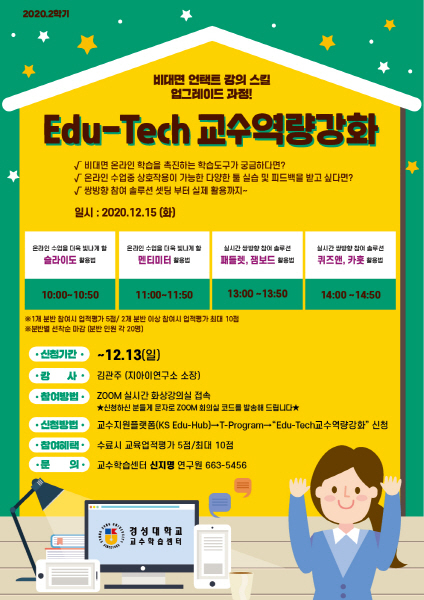 경성대학교 교육혁신본부 교수학습센터는 포스트 코로나 시대를 대비한 교수자의 원활한 온라인 비대면 수업을 위해 ‘Edu-Tech 교수역량강화’ 특강 시리즈를 기획, 운영했다.