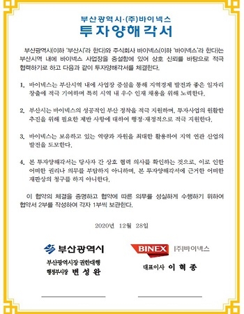부산시가 28일 ㈜바이넥스와 의약품 제조시설을 증설 투자하는 내용의 양해각서를 코로나19 예방 차원에서 서면으로 체결한다고 밝혔다.