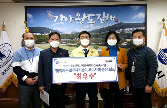 경남 김해시는 행정안전부가 주최한 주민자치형공공서비스 구축사업 '찾아가는 보건복지서비스 우수사례 경진대회'에서 '찾아가는 보건복지서비스 지원체계 구축 분야' 최우수에 선정돼 2천만원의 재정인센티브를 받는다고 28일 밝혔다.