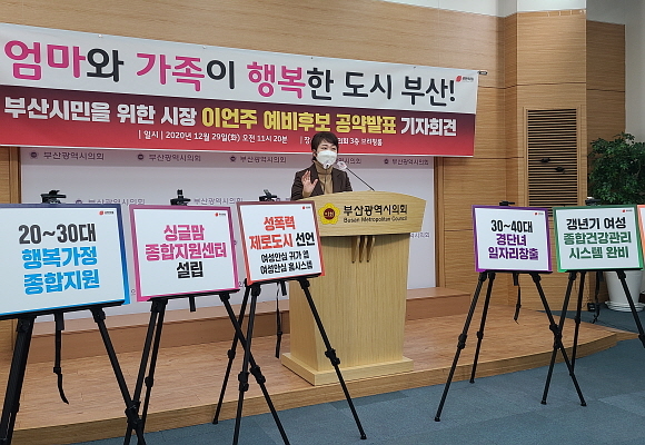 내년 4월 열릴 부산시장 보궐선거에 예비후보로 등록한 이언주 전 의원(국민의힘)이 29일 부산시의회 브리핑실에서 기자회견을 열고 2차 공약으로 ‘여성 공약’을 집중적으로 발표했다.