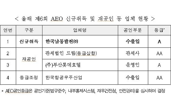 이번에 신규 공인된 업체는 ‘한국남동발전㈜’이다. 또 재공인 업체는 ㈜부산롯데호텔, 관세법인 드림, 한국항공우주산업㈜으로 그 가운데 관세법인 드림과 한국항공우주산업은 AA 등급으로 상향 조정됐다.
