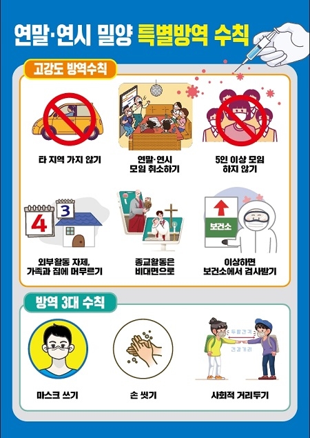 시는 밀양형 특별방역 및 확산방지 대책에 따라 △병원·약국과의 네트워크를 강화해 신속하게 코로나19 의심자 선별 △자가격리자 격리해제 전 검사를 선별검사에서 전수검사로 확대 △요양병원 방역관리실태 특별점검 △음식 덜어먹기 등 음식문화개선 캠페인 △5인 이상 모임 금지를 위해 작목반, 동호회, 방범초소 등 사적 모임 사무실 점검 △연말연시 밀양 특별방역수칙 on-line 홍보 릴레이 등 보다 강도 높고 구체화된 방역 수칙에 맞춰 지도․점검 및 대시민 홍보를 지속적으로 실시해 코로나19 예방과 차단에 총력을 기울일 예정이다.