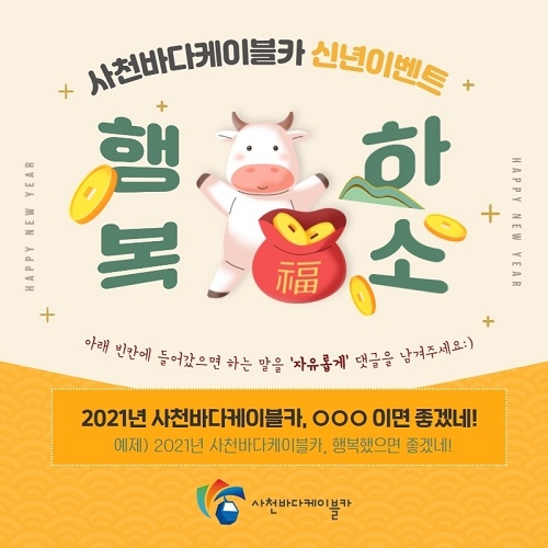 사천시시설관리공단은 신축년 새해를 맞아 '2021년 사천바다케이블카, ○○○이면 좋겠네!' SNS 댓글 이벤트를 진행한다고 31일 밝혔다.